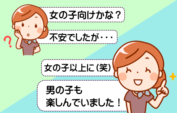 お迎えの際、子どもたちが、たのしかった!またきてほしい!と、口々に話しており、とても嬉しく思いました。