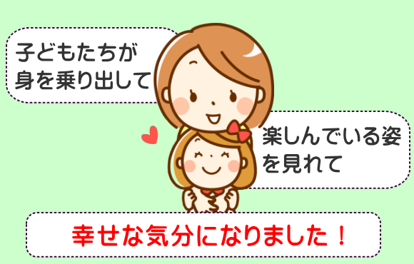 子どもたちのキラキラした姿が見れて、私も嬉しかったし、何より私が楽しませていただきました。保育士の先生方にも好評で、役員の株が上がりました!