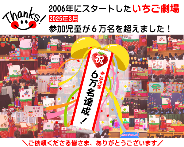 2025年3月、538公演、累計参加児童 60.255名もの子どもたちに、いちご劇場をご覧いただきました!初心を忘れることなく、楽しい時間をお届けすることに、全力を注ぎます。今後とも、どうおよろしくお願いいたします。 <いちご劇場>